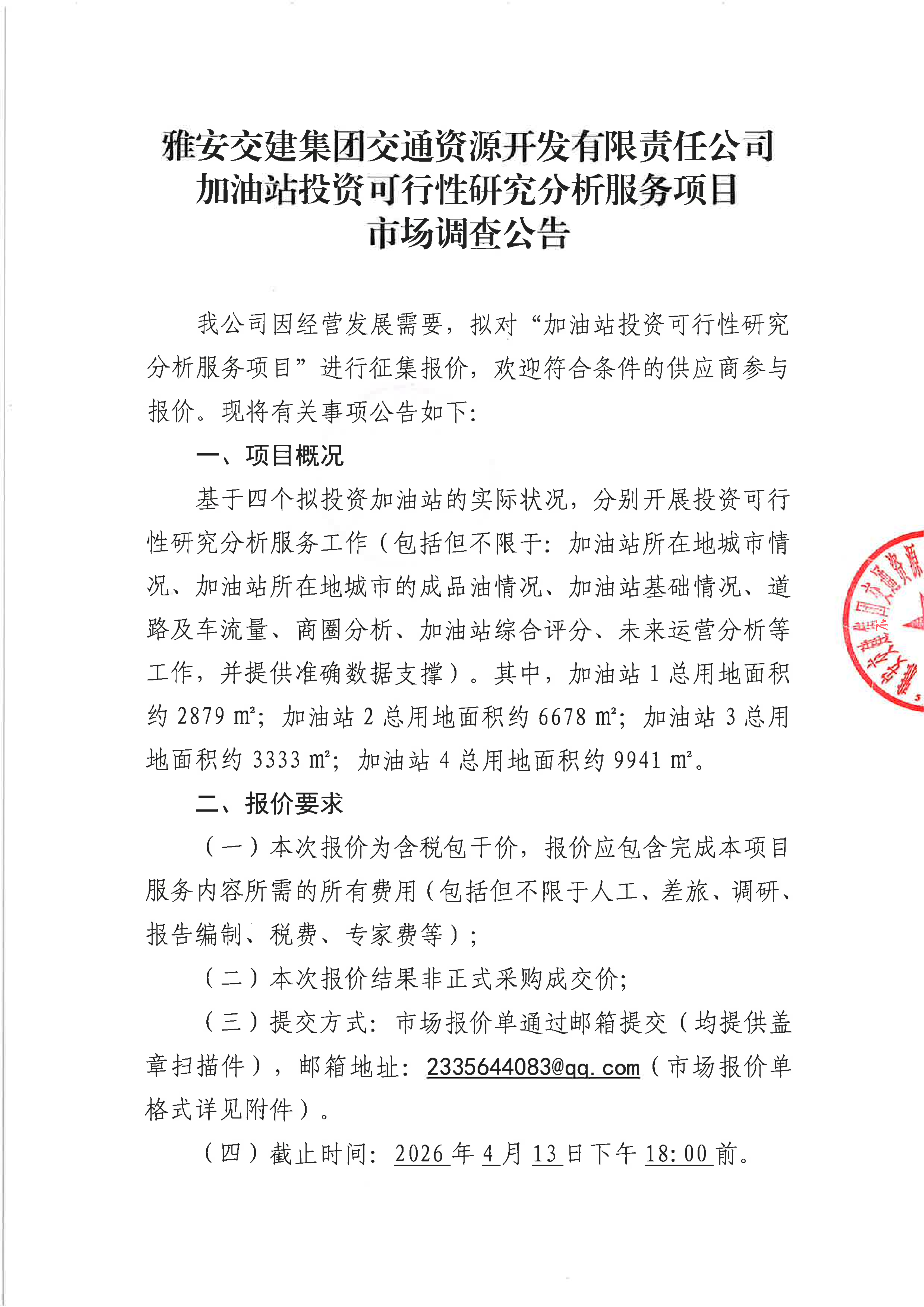 雅安交建集團交通資源開發(fā)有限責(zé)任公司加油站投資可行性研究分析服務(wù)項目市場調(diào)查公告