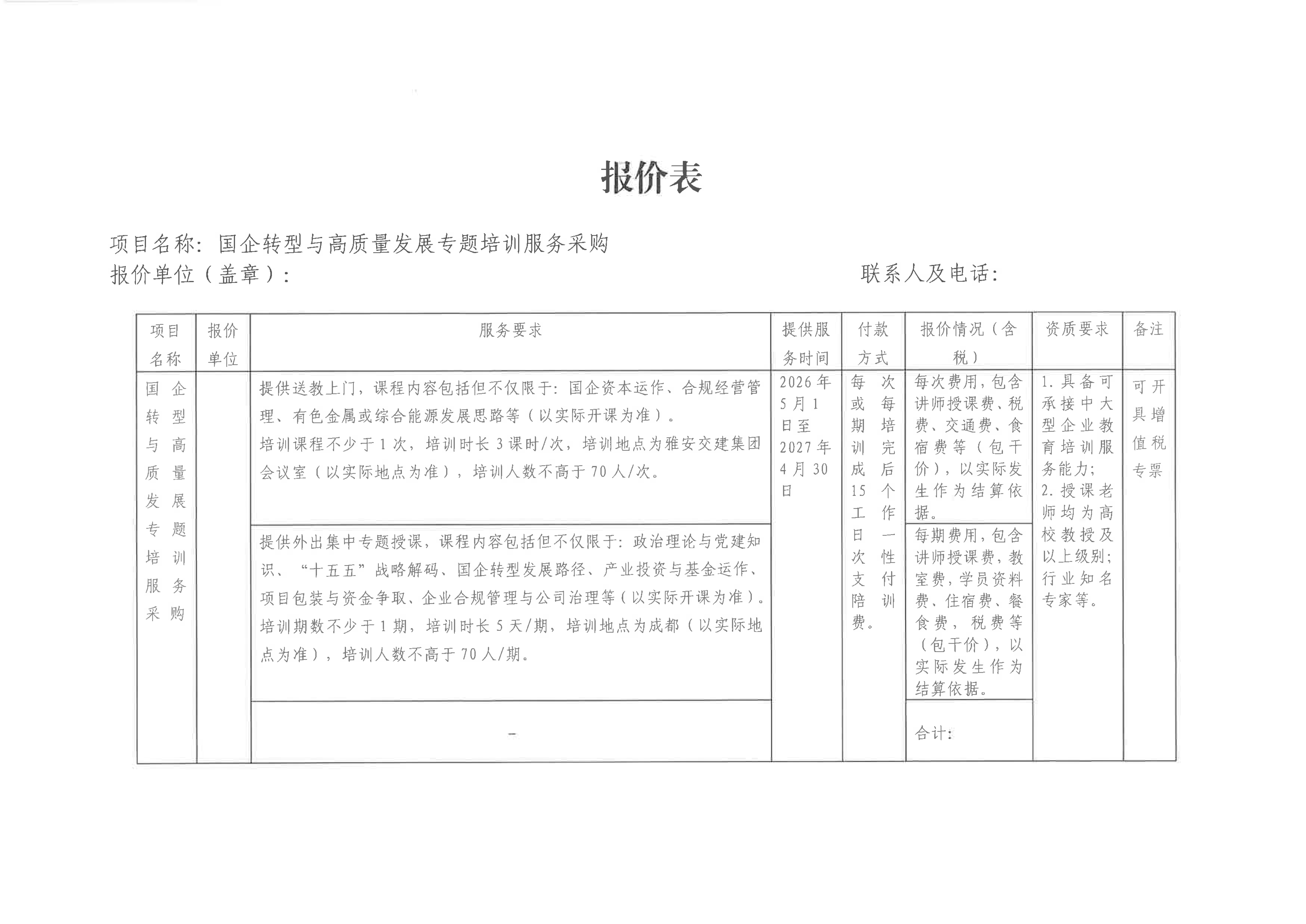 關(guān)于雅安市交通建設(shè)(集團)有限責(zé)任公司國企轉(zhuǎn)型與高質(zhì)量發(fā)展專題培訓(xùn)服務(wù)采購限價的詢價函