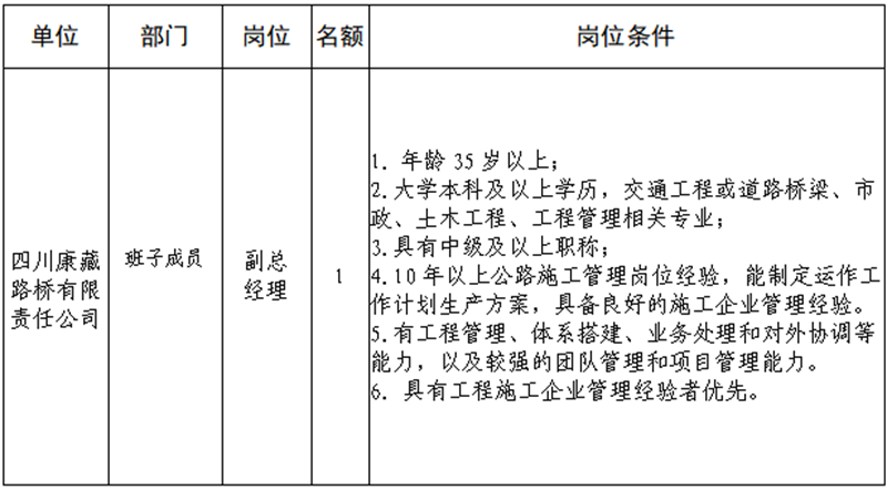 根據(jù)發(fā)展需要,決定面向社會(huì)公開招聘雅安市交通建設(shè)(集團(tuán))有限責(zé)任公司(以下簡(jiǎn)稱“雅安交建集團(tuán)”)所屬子公司班子成員4名,現(xiàn)將有關(guān)事項(xiàng)公告如下: