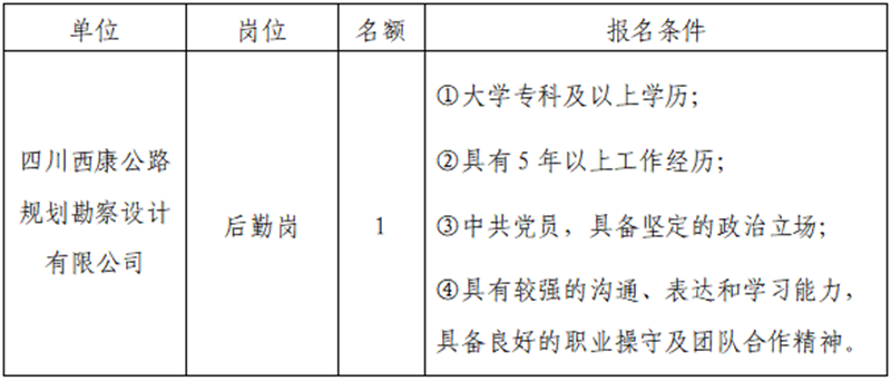 根據(jù)發(fā)展需要,決定面向社會公開招聘雅安市交通建設(shè)(集團)有限責(zé)任公司(以下簡稱“雅安交建集團”)所屬子公司綜合辦公室后勤崗1名,現(xiàn)將有關(guān)事項公告如下: