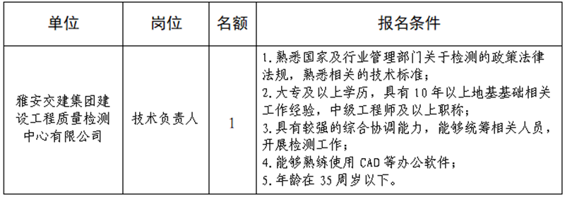 根據(jù)發(fā)展需要,決定面向社會公開招聘雅安市交通建設(shè)(集團)有限責任公司(以下簡稱“雅安交建集團”)所屬子公司工作人員1名,現(xiàn)將有關(guān)事項公告如下: