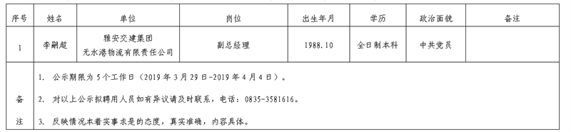 雅安交建集團(tuán)子公司擬聘用人員公示(無水港物流公司)