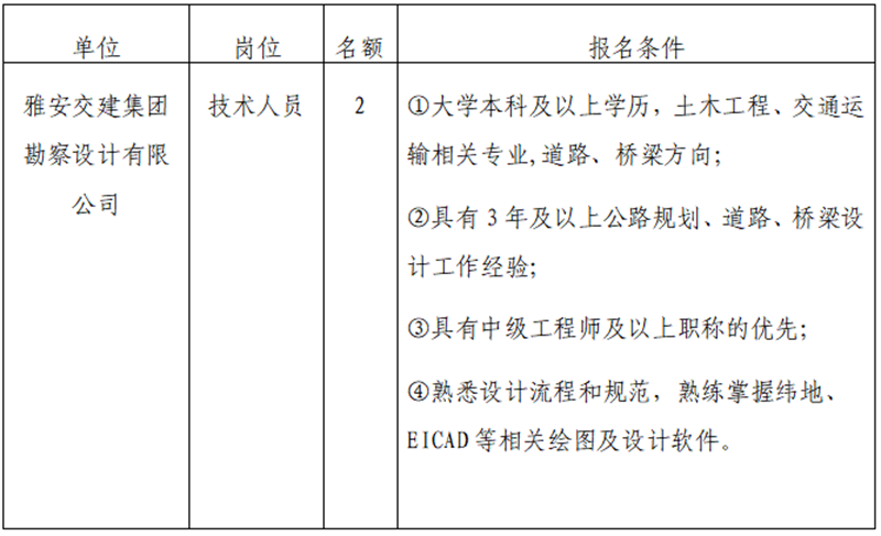 根據(jù)發(fā)展需要,決定面向社會公開招聘雅安市交通建設(shè)(集團)有限責任公司(以下簡稱“雅安交建集團”)所屬子公司工作人員2名,現(xiàn)將有關(guān)事項公告如下:
