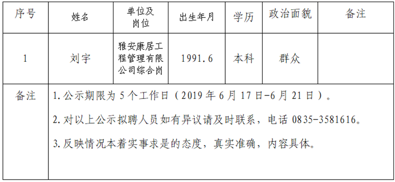 雅安交建集團(tuán)子公司擬聘用人員公示 (康居公司)