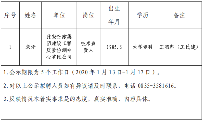 雅安交建集團(tuán)子公司擬聘用人員公示 (工程檢測中心)