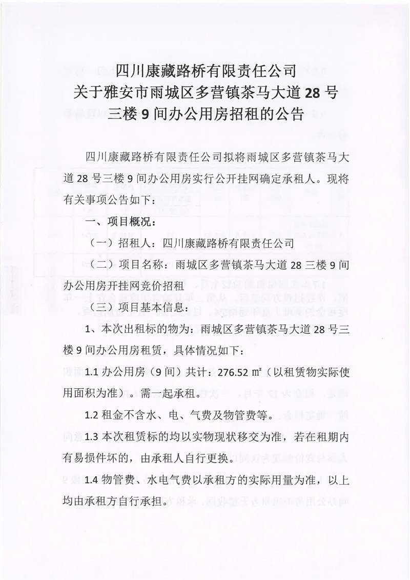四川康藏路橋有限責任公司關(guān)于雅安市雨城區(qū)多營鎮(zhèn)茶馬大道28號三樓9間辦公用房招租的公告