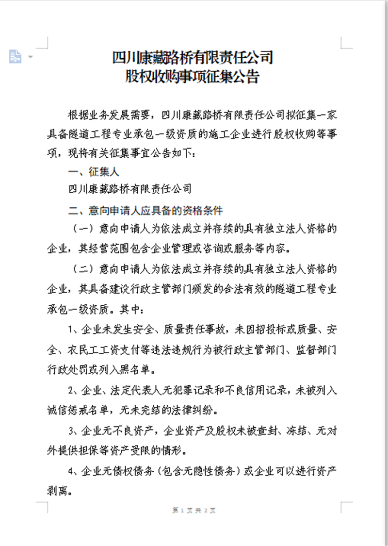 四川康藏路橋有限責(zé)任公司 股權(quán)收購事項(xiàng)征集公告