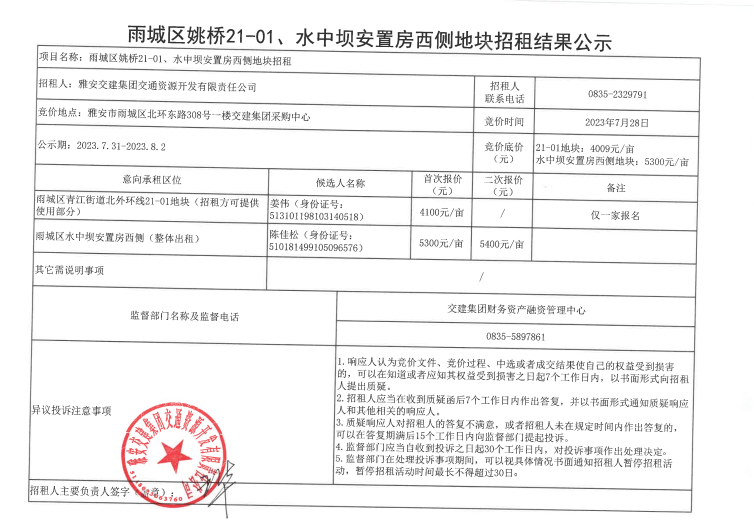 雅安交建集團(tuán)資產(chǎn)經(jīng)營(yíng)管理有限公司雨城區(qū)大興鎮(zhèn)水津關(guān)堆料場(chǎng)龍溪村四組和八組部分閑置臨時(shí)用地招租結(jié)果的公示