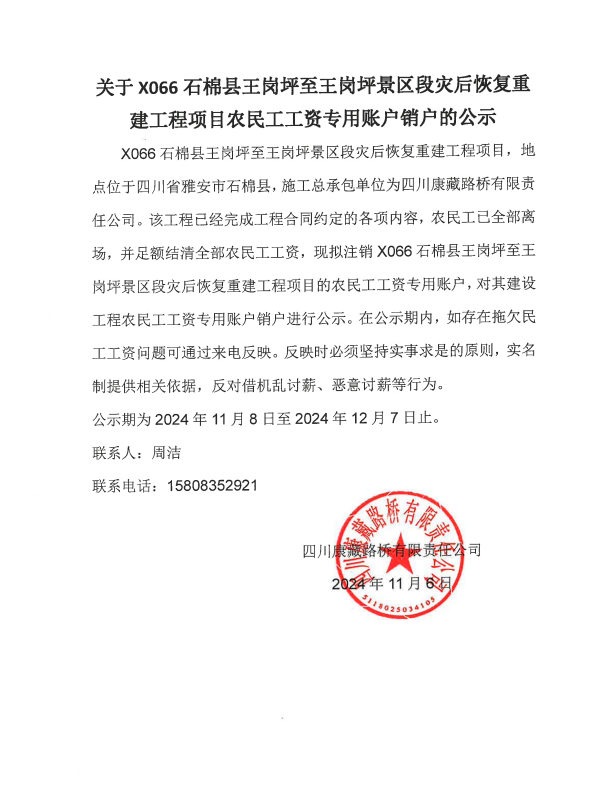 關于X066石棉縣王崗坪至王崗坪景區(qū)段災后恢復重建工程項目農民工工資專用賬戶銷戶的公示