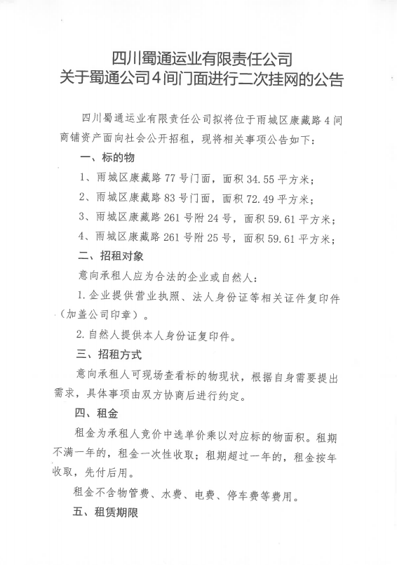 四川蜀通運業(yè)有限責(zé)任公司關(guān)于蜀通公司4間門面進(jìn)行二次掛網(wǎng)的公告