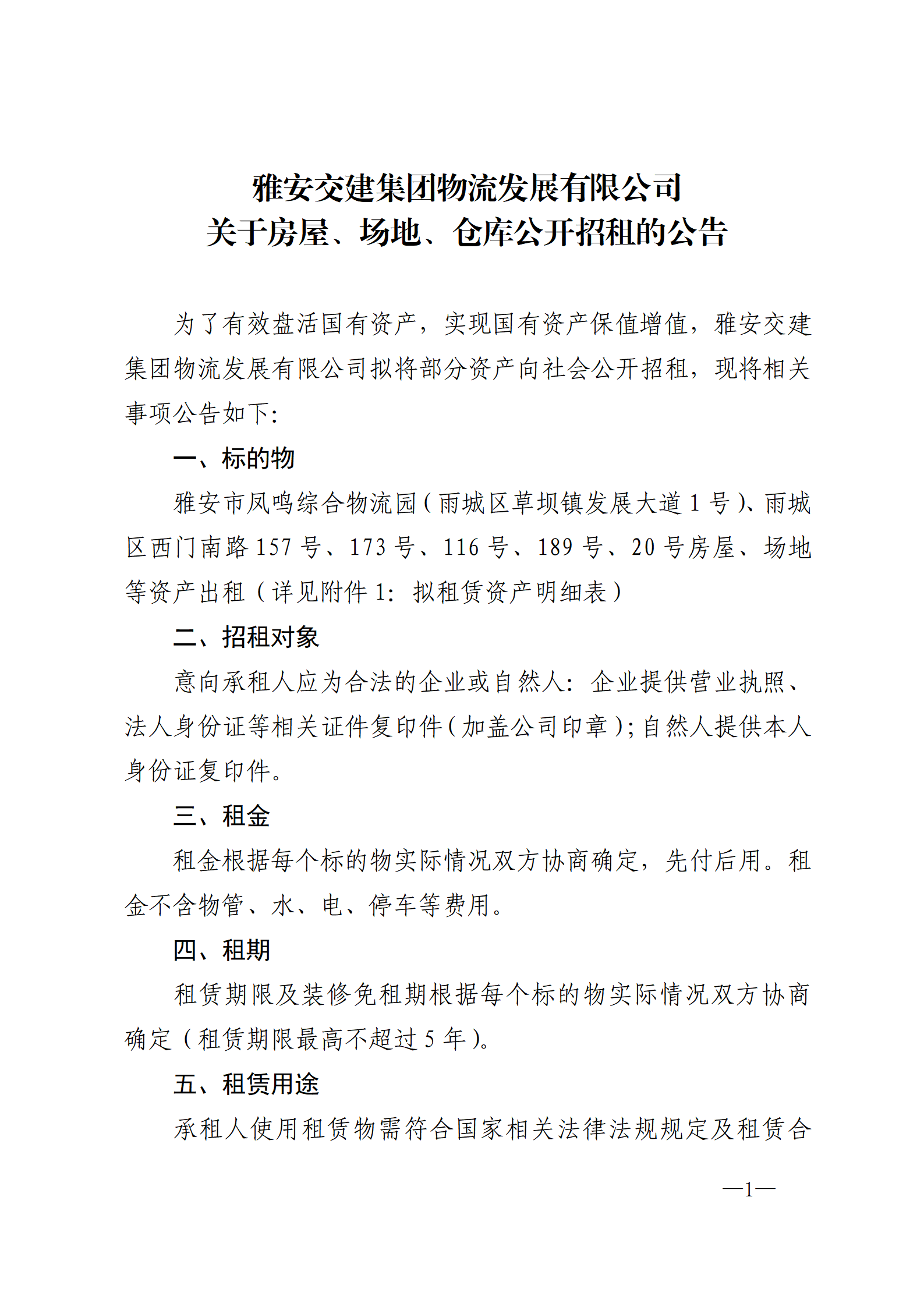 雅安交建集團(tuán)物流發(fā)展有限公司 關(guān)于房屋、場(chǎng)地、倉庫公開招租的公告