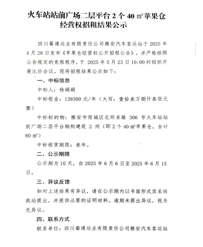 火車站站前廣場二層平臺2個(gè)40㎡蘋果倉經(jīng)營權(quán)招租結(jié)果公示
