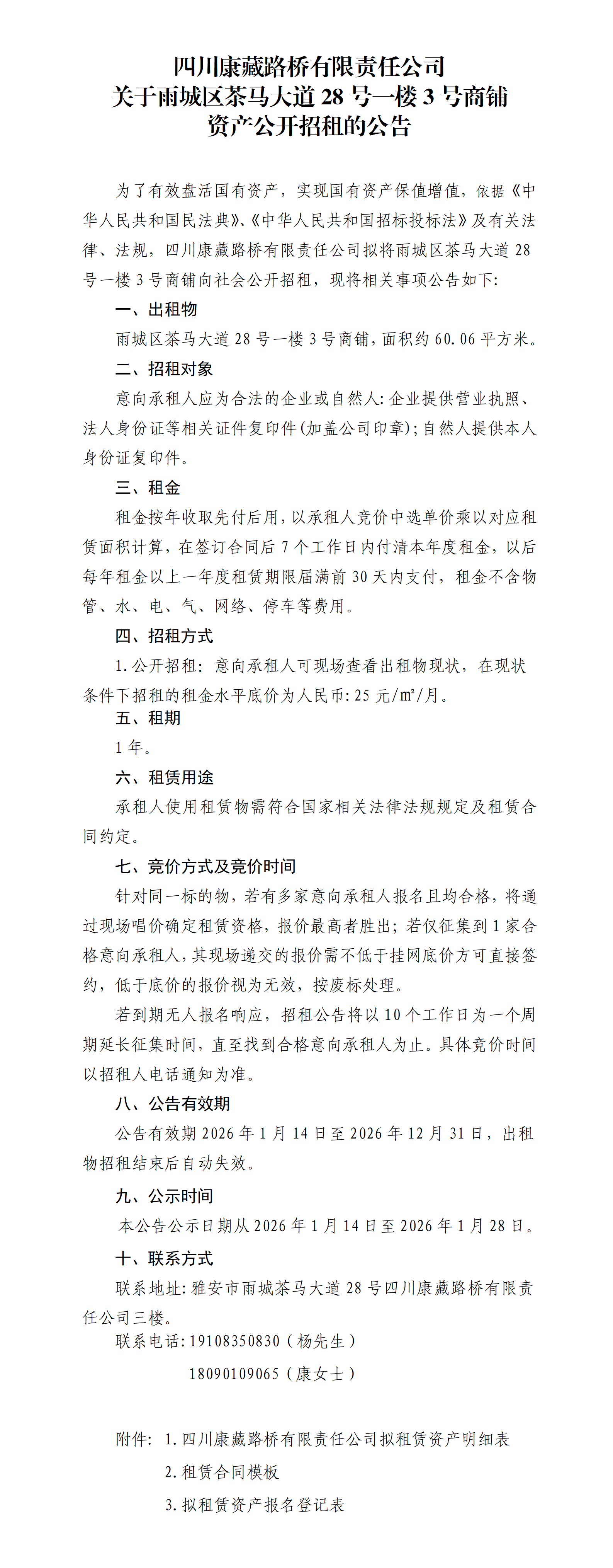 四川康藏路橋有限責(zé)任公司關(guān)于雨城區(qū)茶馬大道28號(hào)一樓3號(hào)商鋪 資產(chǎn)公開(kāi)招租的公告