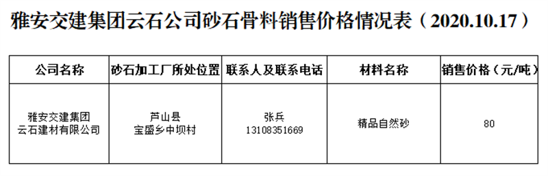 雅安交建集團(tuán)云石公司砂石骨料銷售價格情況表(2020.10.17)