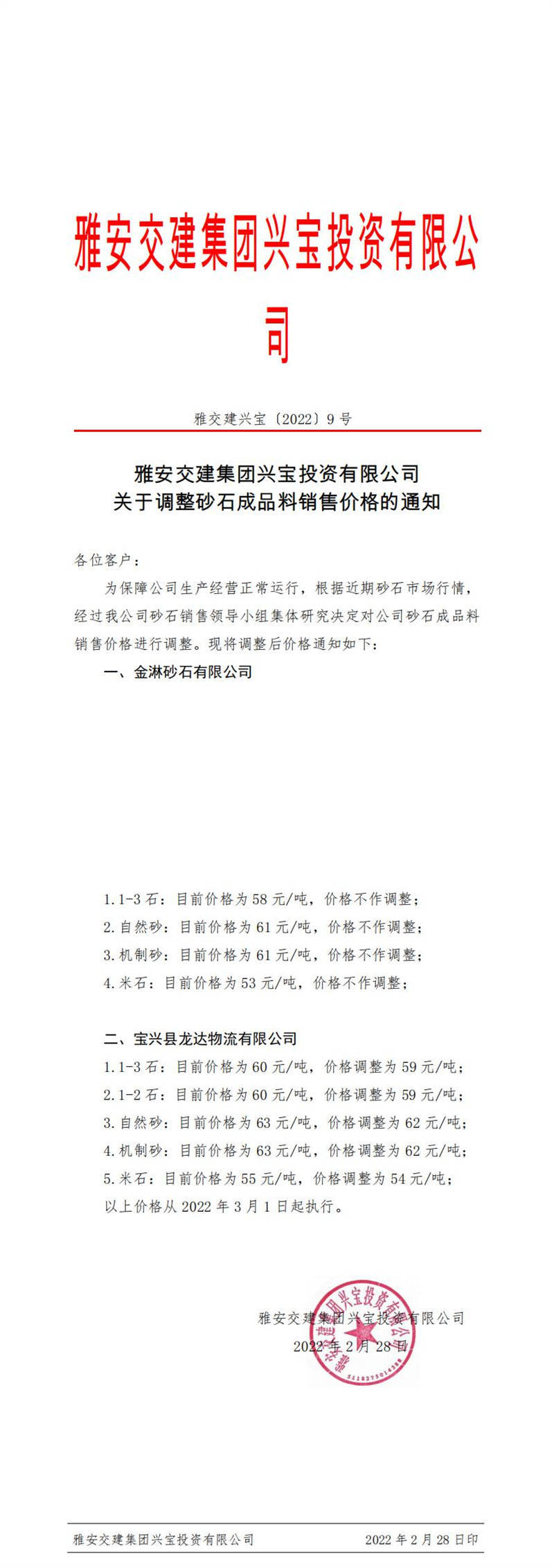 ÑŰ²½»½¨ÅdŒš¹«Ë¾êP(gu¨¡n)ÓÚÕ{(di¨¤o)Õûɰʯ³ÉÆ·ÁÏäNÊÛƒr¸ñµÄ֪ͨ£¨2022-3-1£©