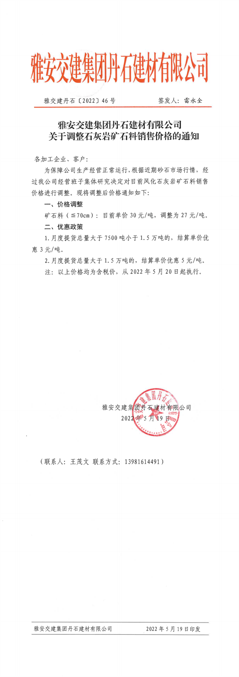 雅安交建集團丹石公司關(guān)于調(diào)整石灰?guī)r礦石料價格的通知-2022-5-19