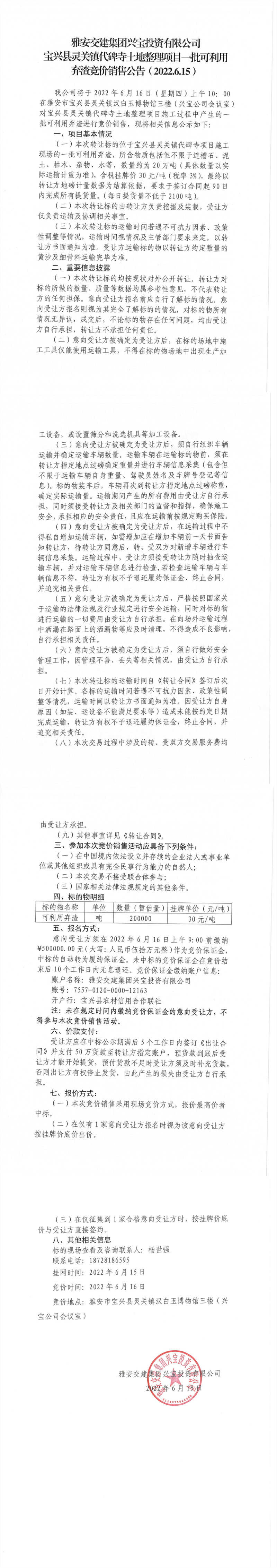 雅安交建集團(tuán)興寶投資有限公司寶興縣靈關(guān)鎮(zhèn)代碑寺土地整理項(xiàng)目-批可利用 棄渣競價(jià)銷售公告( 2022.6.15 )