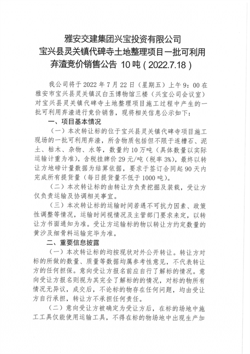 寶興縣靈關(guān)鎮(zhèn)代碑寺土地整理項(xiàng)目一批可利用棄渣競價(jià)銷售公告7.18(10萬噸)
