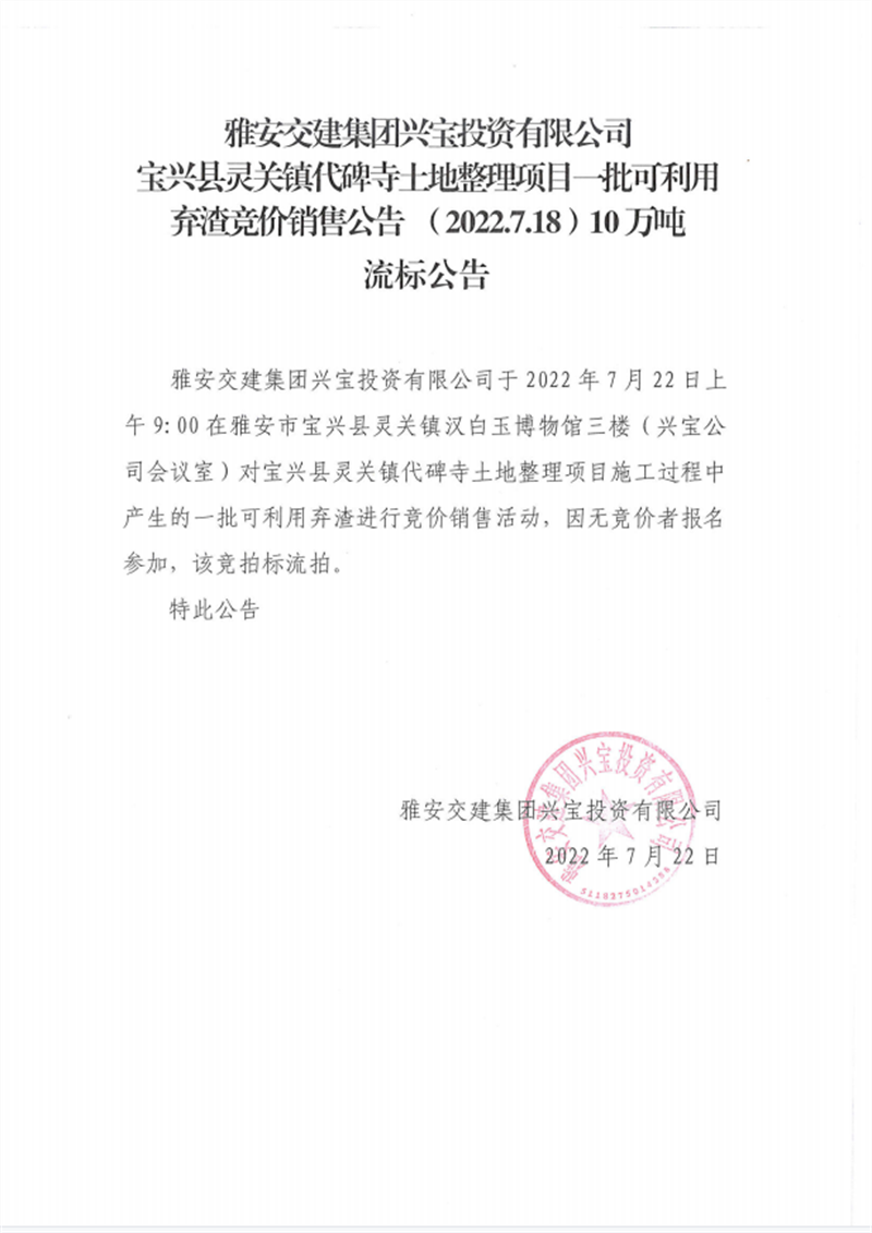 興寶公司寶興縣靈關鎮(zhèn)代碑寺土地整理項目10萬噸可利用棄渣競價銷售掛網公告7.22(10萬噸)