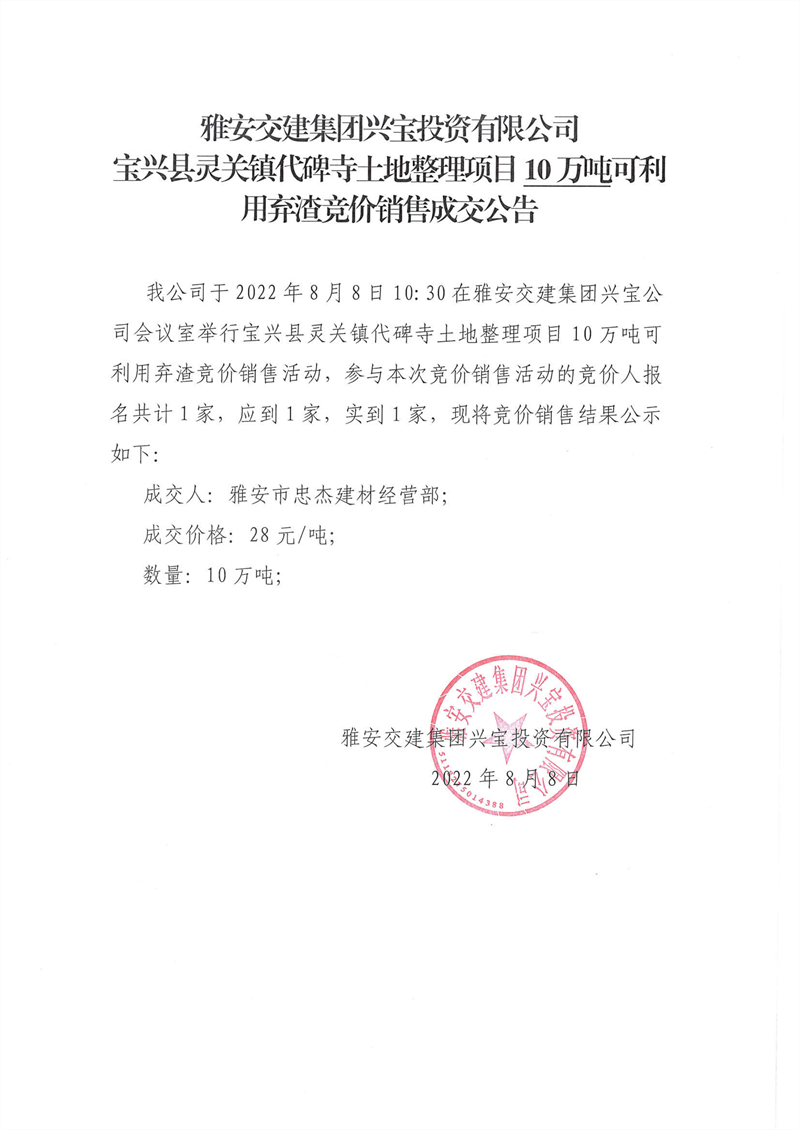 代碑寺土地整理項(xiàng)目100萬(wàn)噸可利用棄渣競(jìng)價(jià)銷售成交公告