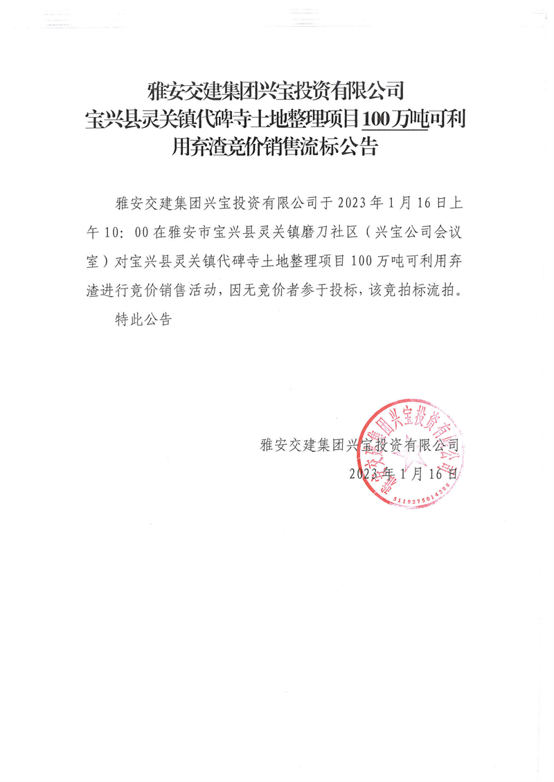雅安交建集團興寶投資有限公司100萬噸可利用棄渣競價銷售流標(biāo)公告(2023.1.16)