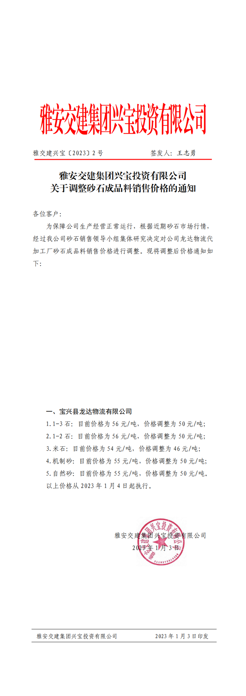 雅交建興寶〔2023〕2號(hào) 關(guān)于調(diào)整砂石成品料銷售價(jià)格的通知-2023-01-03