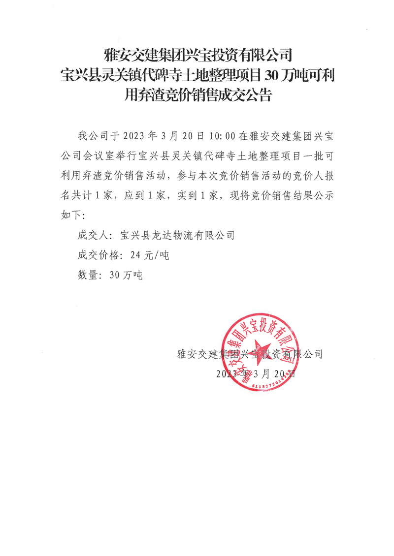 雅安交建集團興寶投資有限公司靈關鎮(zhèn)代碑寺土地整理項目30萬噸可利用棄渣競價銷售成交公告(2023.3.20)