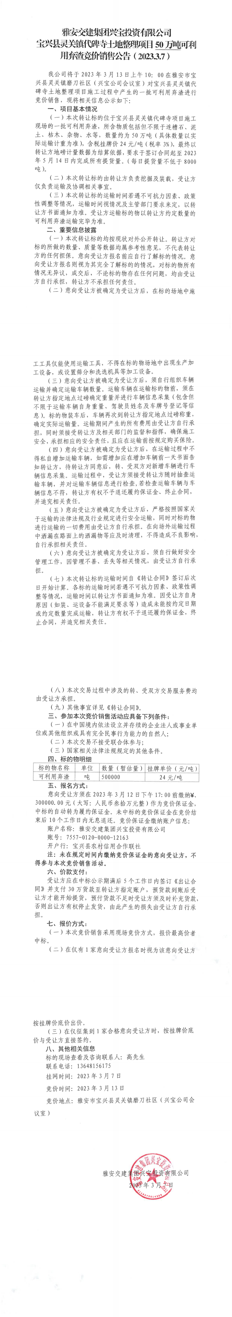 雅安交建集團興寶投資有限公司靈關(guān)鎮(zhèn)代碑寺土地整理項目50萬噸可利用棄渣競價銷售公告(2023.3.7)