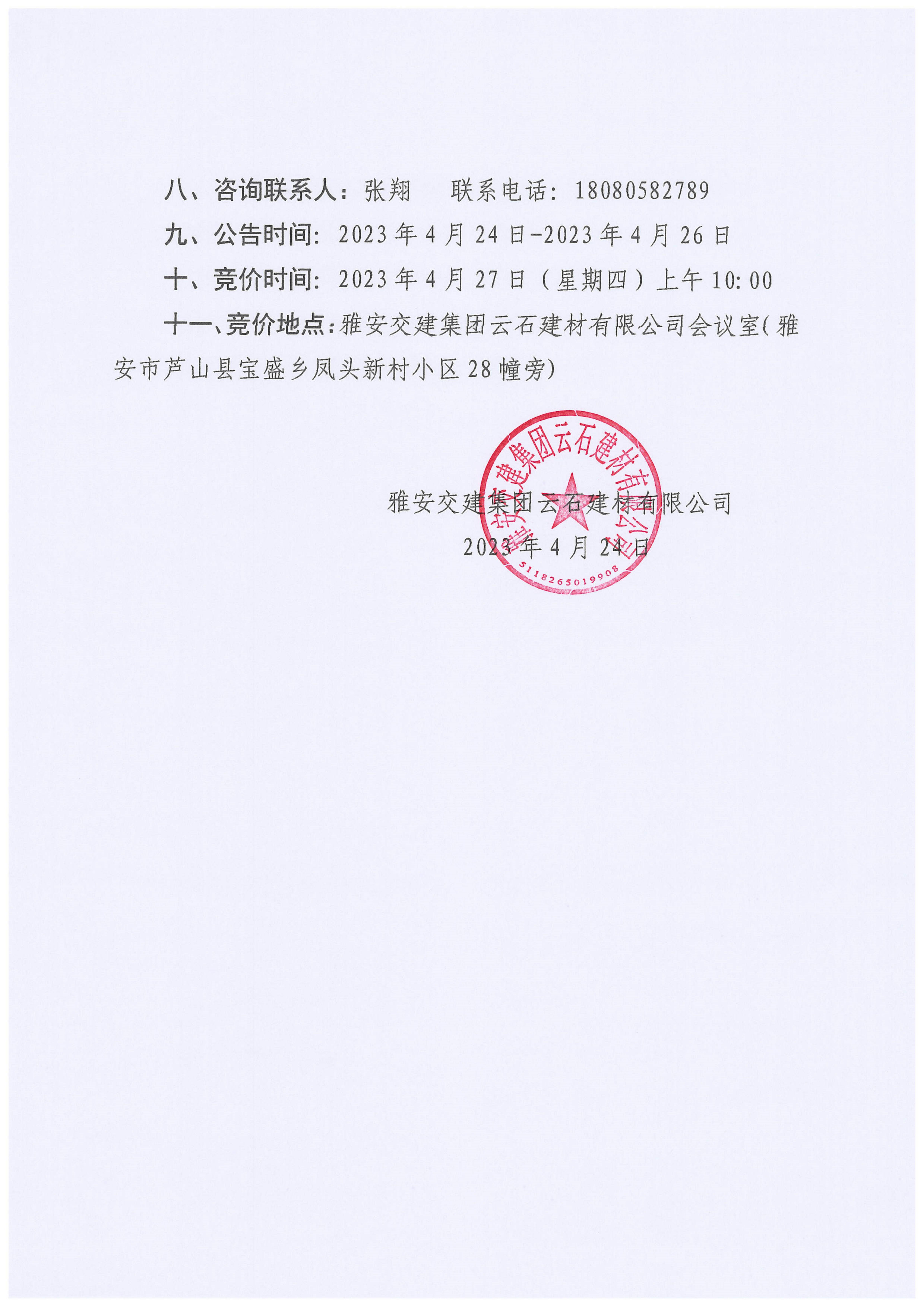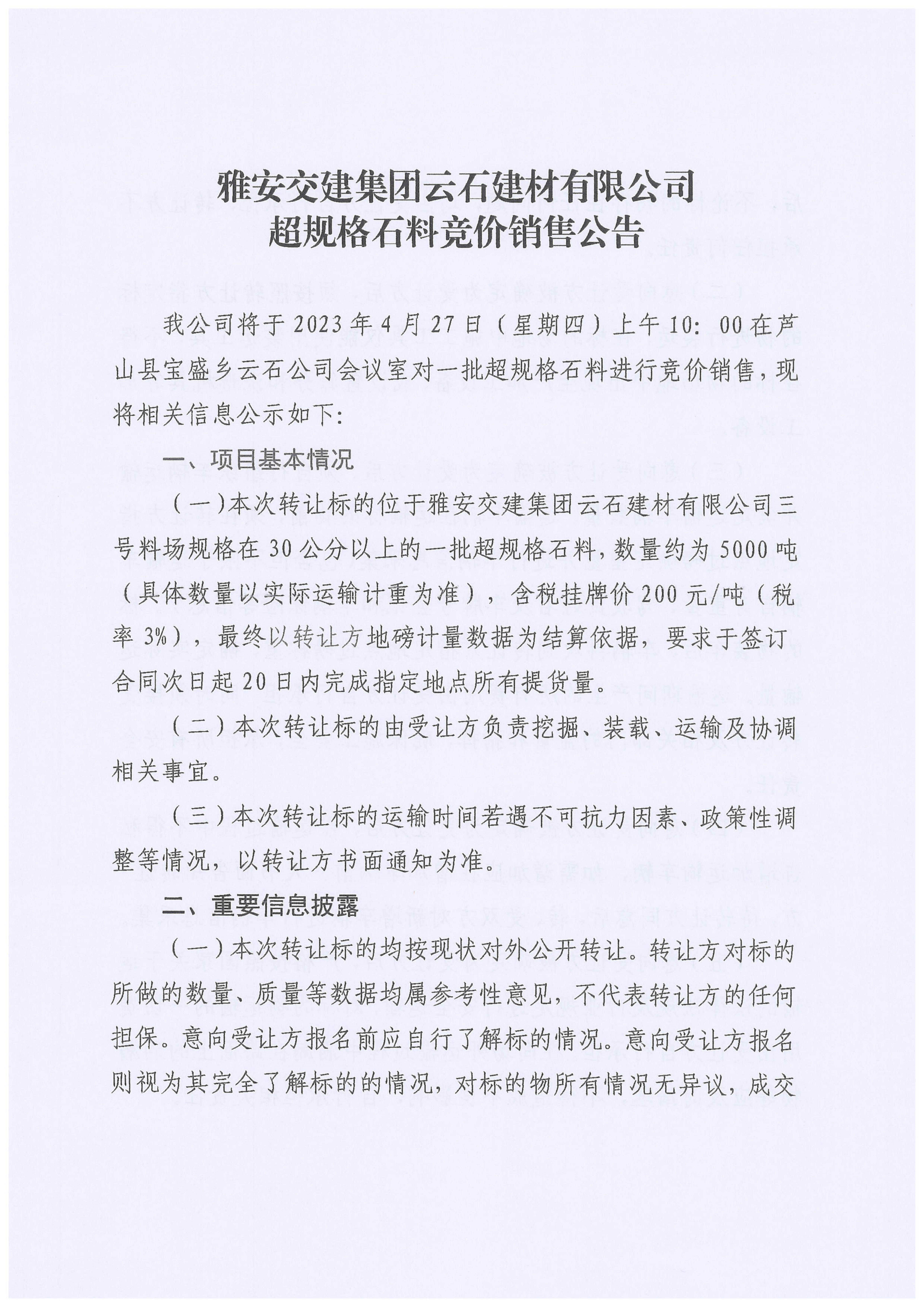 雅交建云石建材有限公司超規(guī)格石料競(jìng)價(jià)銷(xiāo)售公告(2023-4-24)