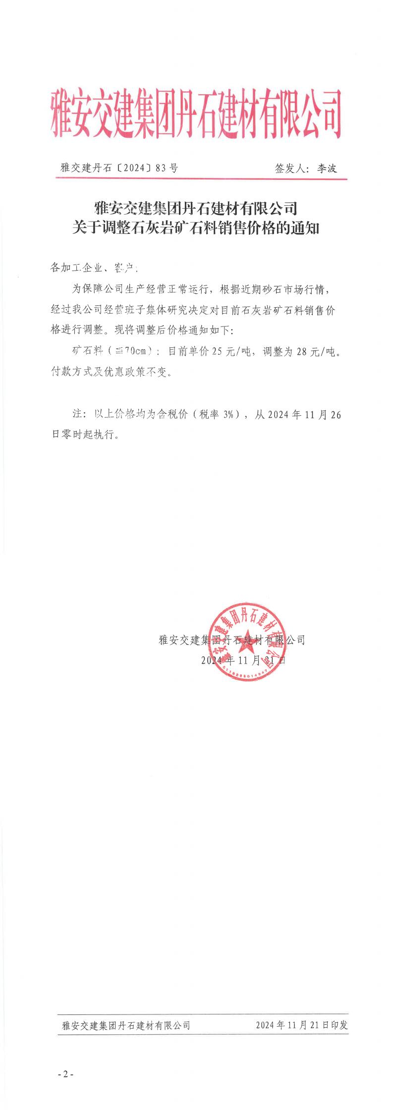 雅安交建集團丹石公司關于調(diào)整礦石料的通知(2024-11-22)
