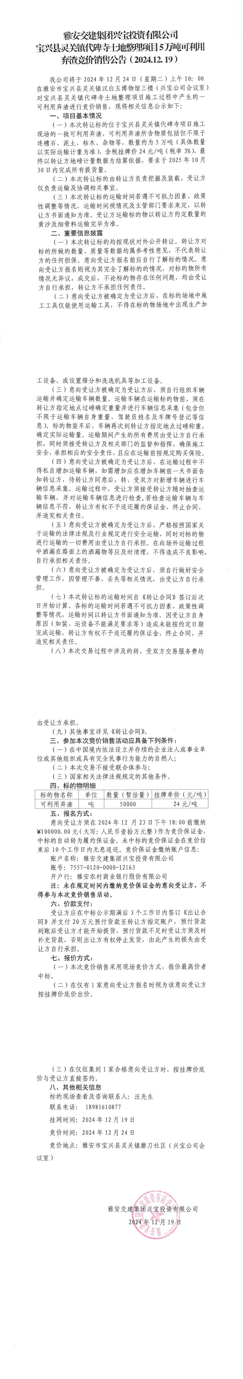 雅安交建集團(tuán)興寶投資有限公司靈關(guān)鎮(zhèn)代碑寺土地整理項(xiàng)目5萬噸可利用棄渣競價(jià)銷售公告(2024.12.19)