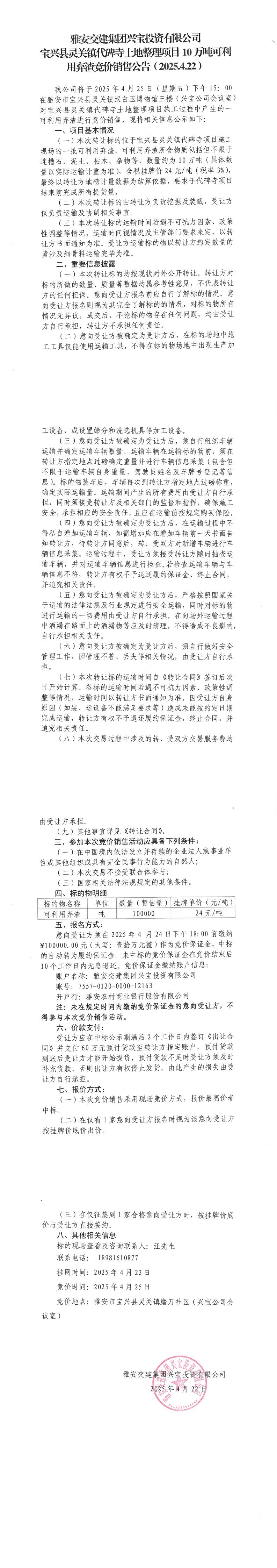 雅安交建集團興寶投資有限公司寶興縣靈關鎮(zhèn)代碑寺土地整理項目10萬噸可利用棄渣競價銷售公告